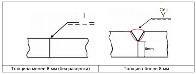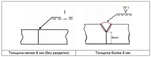 - сварка ведётся без разделки кромок (для аргодуговой сварки - до 3 мм, для плазменной сварки - 6-8 мм, для бОльших толщин уже используется разделка)