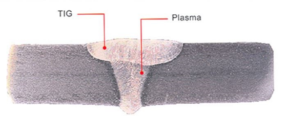 При толщине металла более 8 мм используется комбинированный способ сварки Плазма с подачей или без подачи присадочной проволоки для корневого прохода + ТИГ с подачей присадочной проволоки для заполняющего прохода. Сварка осуществляется с использованием Ỵ разделки кромок. Притупление нижней части - 6 мм, разделка верхней части 35 градусов. Сварка осуществляется плазменной и ТИГ горелками, расположенными одна за другой.