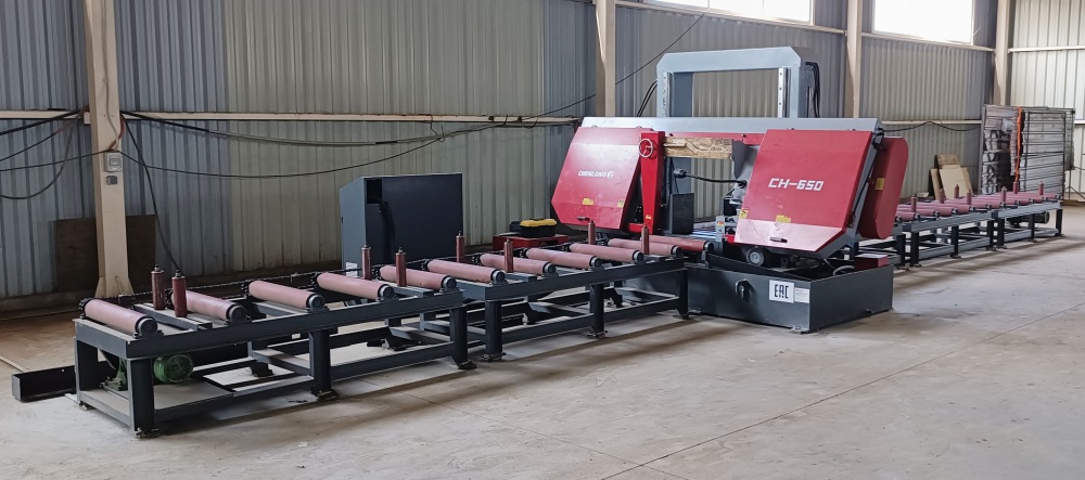 |  Специализированный ленточнопильный станок для резки труб диаметром до 630 мм с приводными рольгангами в цехе клиента