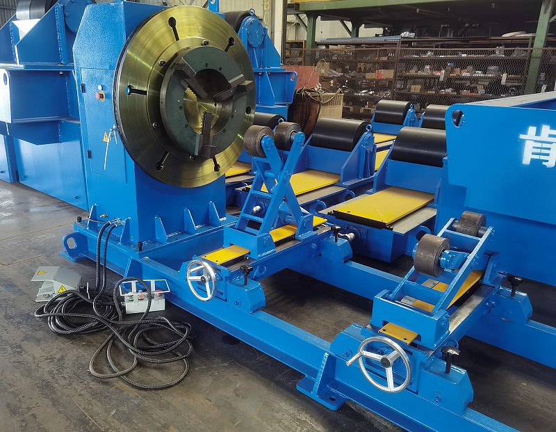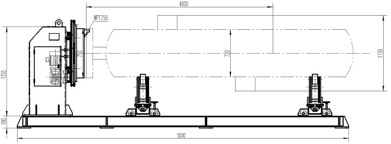 Установка включает горизонтальный вращатель с мощным зажимным патроном WPS-750, две поддерживающие опоры, смонтированные на холостых рельсовых тележках, рамное основание с рельсами, пульт управления, педаль.